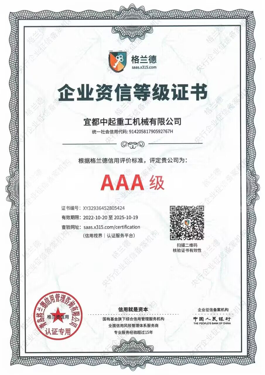 2022年宜都中起重工機械有限公司被格蘭德信用評價為AAA級企業(yè)。